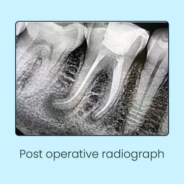 Upon examination, the tooth was asymptomatic with no swelling or tenderness on percussion. On taking a radiograph saw a very evident peri-apical radiolucency wrt both mesial and distal canals. The canals were underfilled and a leaky post endo-restoration