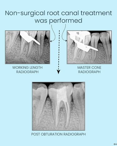 A simple GP point tracing and pulp testing confirmed the diagnosis. A well-executed non-surgical root canal treatment resolved the infection at its source. The images speak for themselves — 1 month vs. 6 months follow-up show complete healing.